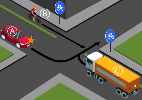 - Igen (A KRESZ szerint ugyan az „A” jelű jármű jogi értelemben egyenesen halad (éppen ezért nem kötelező az irányjelző használata), azonban fizikai értelemben mégis bekanyarodónak számít, tehát vonatkozik rá a fenti elsőbbségadási kötelezettség.)