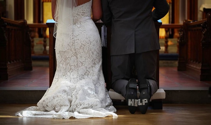 13. Nem értettem, hogy a vendégek miért kuncognak az esküvőnkön, aztán a fotókról kiderült, hogy a férjem cipőtalpra írt üzenettel próbált segítséget kérni tőlük.