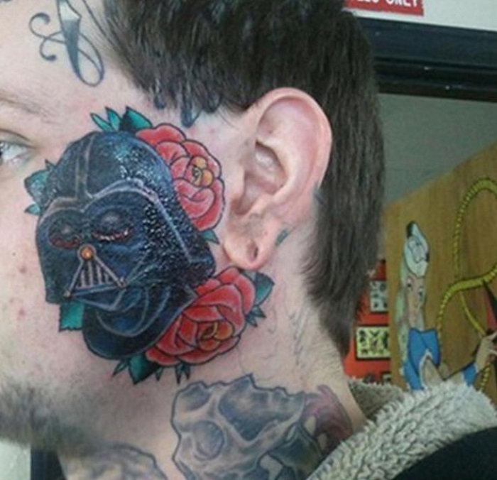 10. Egy Star Wars rajongó igazán „ízléses” tetoválást visel az arcán: Darth Vader vörös rózsák társaságában.