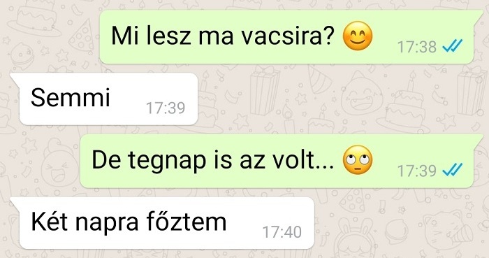 1. A férj túl egyhangúnak találta az otthoni kosztot, de a feleségét ez nem igazán hatotta meg. A férj kénytelen azt enni, ami van. Vagyis ami nincs…