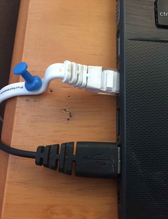 3. Az édesanyám panaszkodott, hogy folyton szakadozik a net. Megnéztem, hogy mi lehet a probléma, és ez a látvány fogadott. Amikor megkérdeztem, hogy ezt mégis hogy gondolta, akkor azt válaszolta, hogy megelégelte, hogy az internetkábel folyton lecsúszik az asztal mellé, amikor kihúzza, ezért rögzítette: