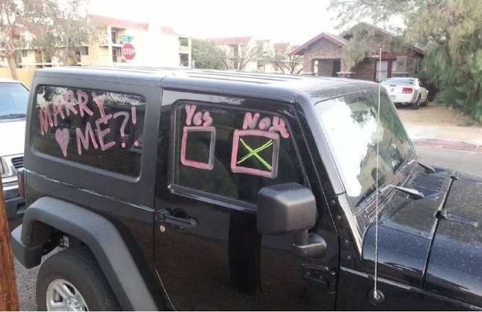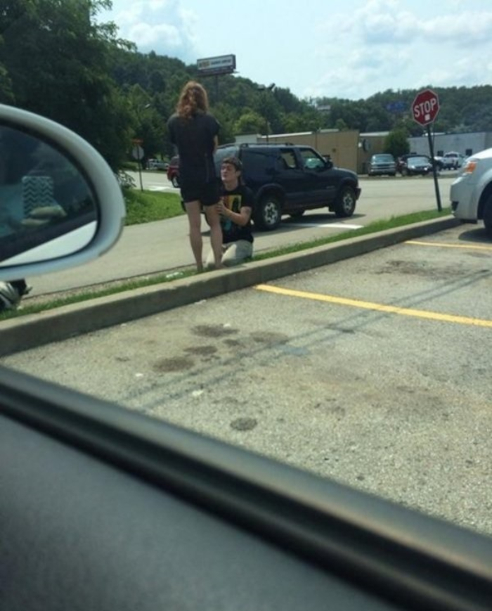 (9) A srác feltehetőleg „sokat” agyalhatott azon, hogy hol kérje meg a barátnője kezét. Végül egy szemetes parkolóra esett a választása. És akkor egyesek még képesek azt állítani, hogy mára már kiveszett a romantika a világunkból.