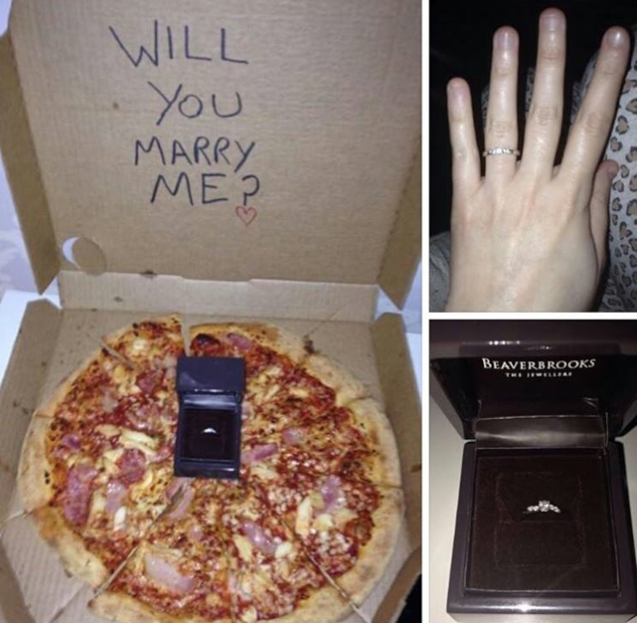 (8) Két legyet egy csapásra: a fickó a lánykérést és a vacsit is letudta egyben. Mégis ki tudna nemet mondani egy pizzára? Hiszen a pizza egy egész életre szóló szerelem.