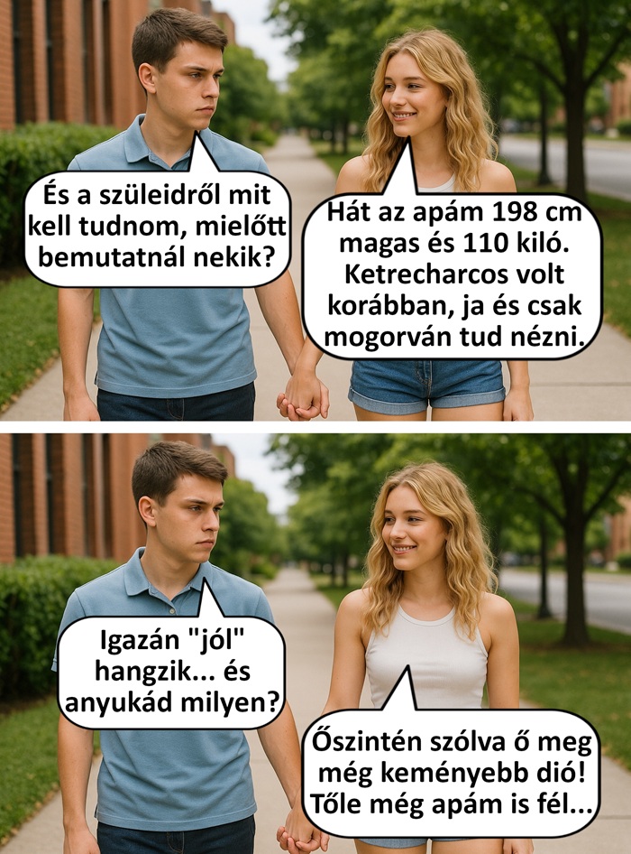 – Amikor az apád a kocsikról, a fociról, vagy a horgászásról kezd el nekem beszélni, akkor a kezembe veszem a telefonomat, hogy elszórakoztassam magam. A múltkor pl. úgy döntöttem, hogy a zsiráfokról fogok olvasni közben, és hát elég sok dolgot megtanultam róluk.