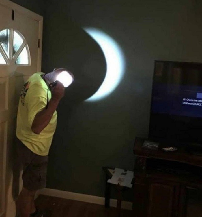 12. Amikor hazaértem a munkából, a férjem azzal fogadott, hogy szeretne mutatni nekem valami érdekeset, amit most fedezett fel. Ezután elővett egy zseblámpát, amivel megvilágította a saját fejét, és így szólt: „Nézd, holdfogyatkozás!”