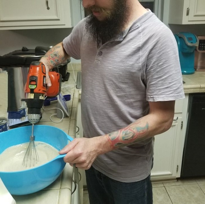 7. A férjem sütés közben az elromlott botmixerünk helyett az akkus fúróját hívta segítségül.