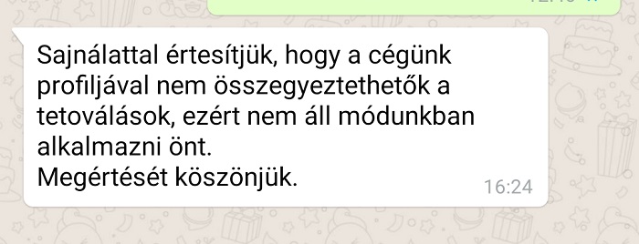 3. Egyszer egy biliárdszalonban voltam állásinterjún. Egy órán keresztül biliárdoztam a főnökkel, miközben kötetlenül beszélgettünk egymással. A játék befejeztével kezet fogott velem a főnök, majd közölte, hogy jót játszottunk, de nem vehet fel olyat, akinek tetoválása van. Ezt már az első percben is közölhette volna velem, ugyanis jól látható helyen van a tetoválásom.