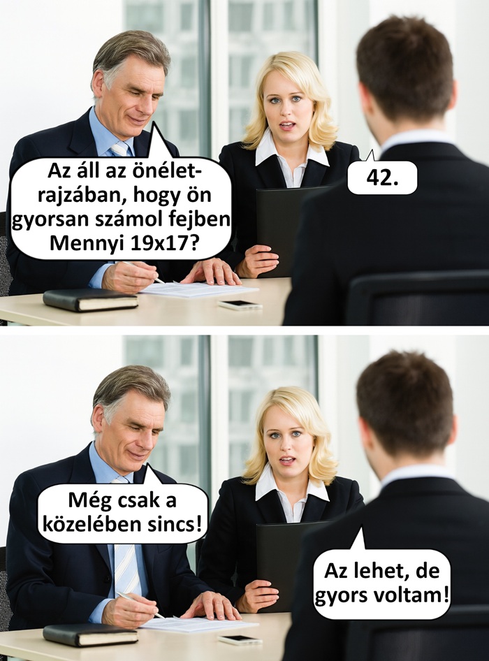 7. Megkaptam az állást, majd elmondta a főnök, hogy az az ember fog betanítani, akit alkalmatlanság miatt néhány napja elbocsátott, és az ő helyét fogom átvenni. Ekkor megkérdeztem, hogy mégis hogyan taníthat be engem egy olyan illető, akit pont az alkalmatlansága miatt rúgott ki, mire elgondolkodott egy pillanatra, majd közölte, hogy mégsem vagyok felvéve.