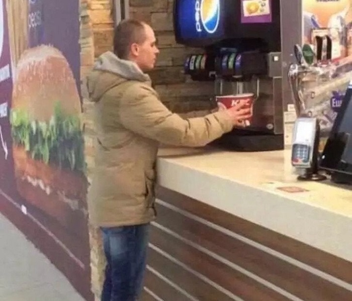 11. A srác vélhetően nem akart folyton az üdítőital-automatához rohangálni, hogy újratöltse a poharát, ezért inkább a csirkés kosarát töltötte meg.