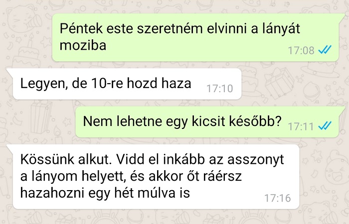 6. Apával lehet próbálkozni az alkudozással, csak épp nem sok értelme van. Bár az is meglehet, hogy a fiú mondandója elgondolkodtatta.