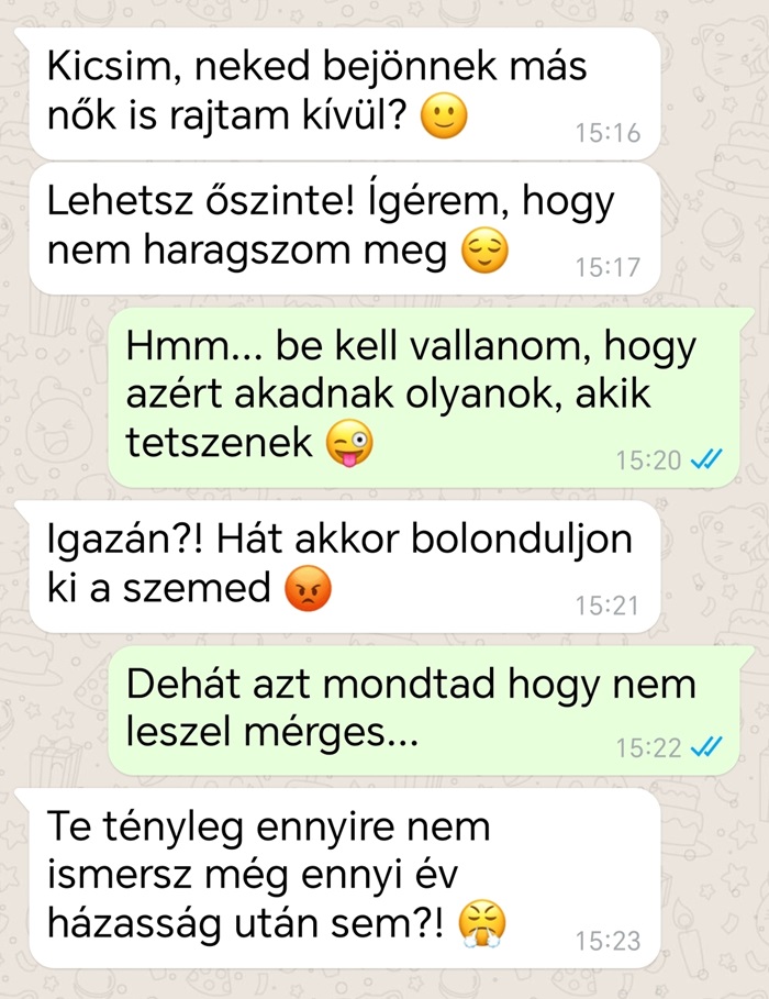A házasság – papíron legalábbis – egy életre szóló szövetség két ember között, amit kölcsönös szeretet, tisztelet és némi lelki rugalmasság tart össze. A valóságban viszont gyakran inkább egy furcsa társasjátékra emlékeztet, ahol senki sem olvasta el rendesen a szabályokat. Az igazán jó házasságok ritkák, de nem attól jók, hogy benne minden mindig tökéletes. Sőt. A boldog párok is néha vitáznak, idegesítik egymást, de ez része a csomagnak – nem hibája. Ha valaki azt állítja, hogy még soha nem akarta becsomagolni a párját és elküldeni egy egyirányú űrutazásra, az vagy hazudik, vagy egy robot. És egyébként is: a humor az egyik legjobb ragasztó. Ha tudtok együtt nevetni magatokon, akkor talán még van remény.