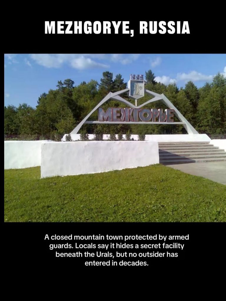 Az oroszországi Ural-hegységben található Mezhgorye egy teljes város, amelyet katonai célokra építettek. A belépés szigorúan tiltott, és a város körül számos titok és legenda kering. Egyesek szerint nukleáris fegyvereket rejtenek itt, mások szerint stratégiai létesítmények találhatók a föld alatt. Mezhgorye a hidegháború egyik öröksége, amely ma is titokzatos.