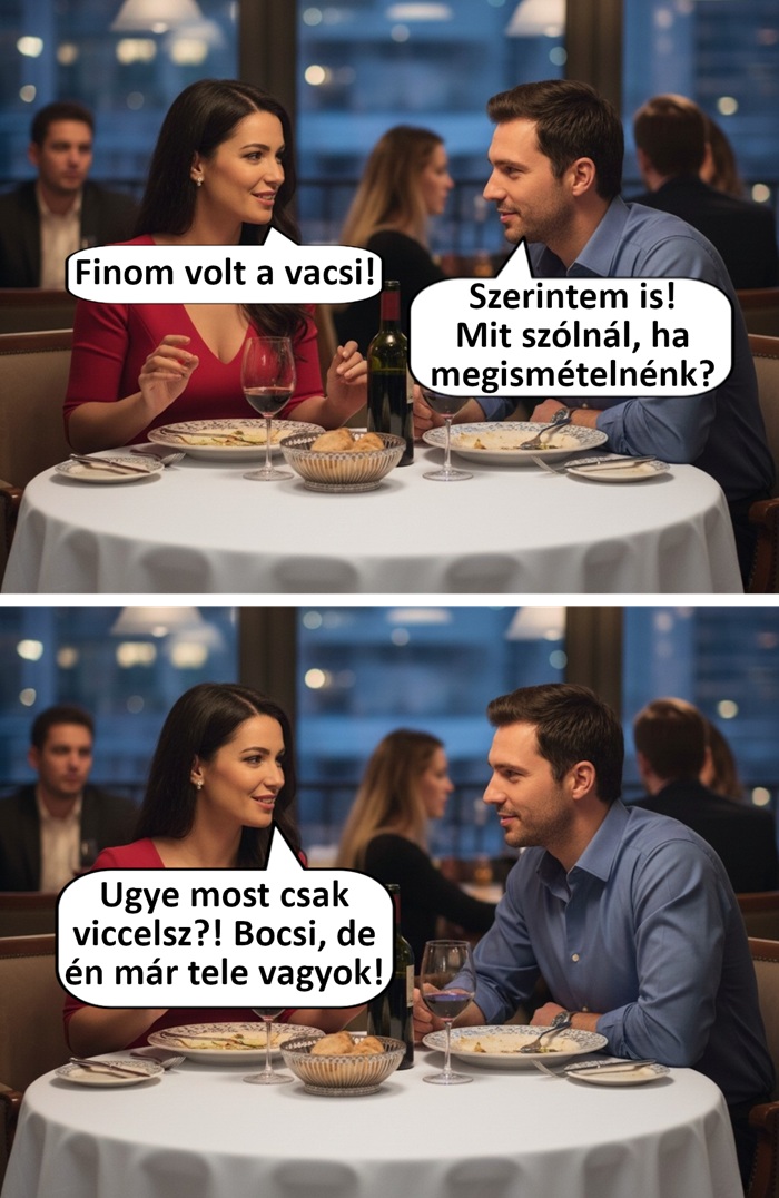 6. Életem első és egyben utolsó vakrandiján a lány végig nagyon szótlan volt. Miután pedig megette a rendelt ételét, gyorsan elköszönt és elsétált. Ezután ránéztem a telefonomra, és észrevettem, hogy még korábban a kaptam egy üzenetet a randipartneremtől, hogy nem tud eljönni a találkánkra. Már csak az a kérdés, hogy én akkor mégis kivel vacsoráztam?