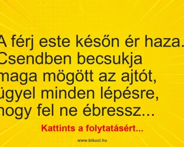 Vicc: A férj este későn ér haza. Csendben becsukja maga mögött az ajtót…